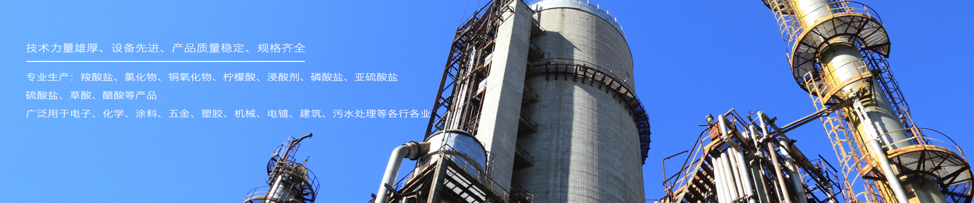 主要產(chǎn)品有:羧酸鹽、氯化物、銅氧化物、檸檬酸、浸酸劑、磷酸鹽、亞硫酸鹽、硫酸鹽、草酸、醋酸等,廣泛用于電子、化學(xué)、涂料、五金、塑膠、機械、電鍍、建筑、污水處理等各行各業(yè)。